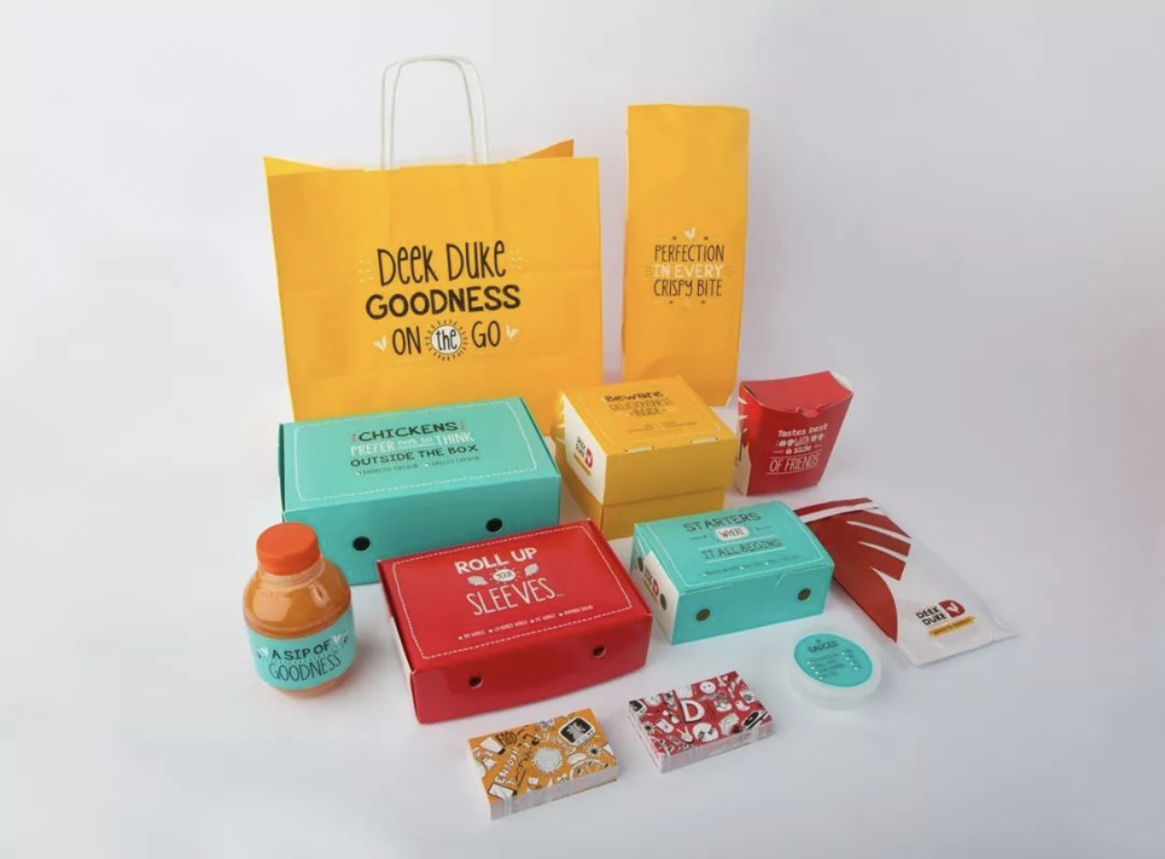 這是一家國(guó)外的炸雞快餐店外賣(mài)包裝設(shè)計(jì),其外賣(mài)包裝采用卡通風(fēng)格的插畫(huà)設(shè)計(jì),運(yùn)用鮮艷且豐富的色彩搭配,深受低年齡層消費(fèi)者的喜歡。
