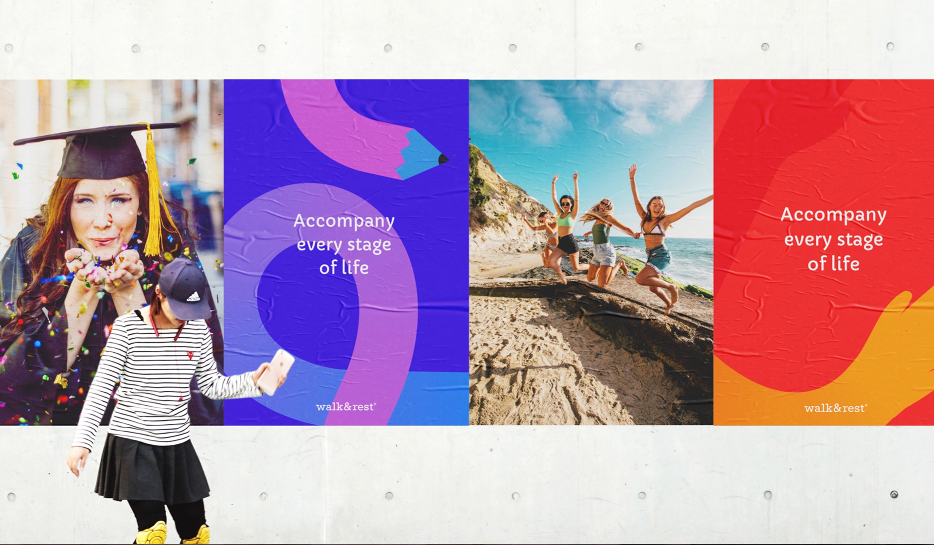 解決方案:煥識品牌創意機構受walk&rest的邀請為其針對中國市場需求進行全方位的品牌戰略定位規劃與品牌形象設計煥新及整套vi設計等工作。我們通過前期的品牌探索及市場研究提出品牌定位方向為“陪伴人生每一階段”,并將品牌定位轉化為品牌視覺形象設計語言發展至整套vi設計系統中。同時采用現代的設計手法與品牌文化結合,透過純度較高的繽紛色彩與提煉出來的超級符號“&”記憶形成強烈的品牌印象,采用輕松自由的圖形延展方式,準確的傳達walk&rest的品牌定位“陪伴你人生每一階段”的訊息,期望將walk&rest從專業、成熟、理性的品牌印象轉變為輕松、自由、樂趣、陪伴的品牌印象,更貼近中國消費者,形成獨有品牌資產。